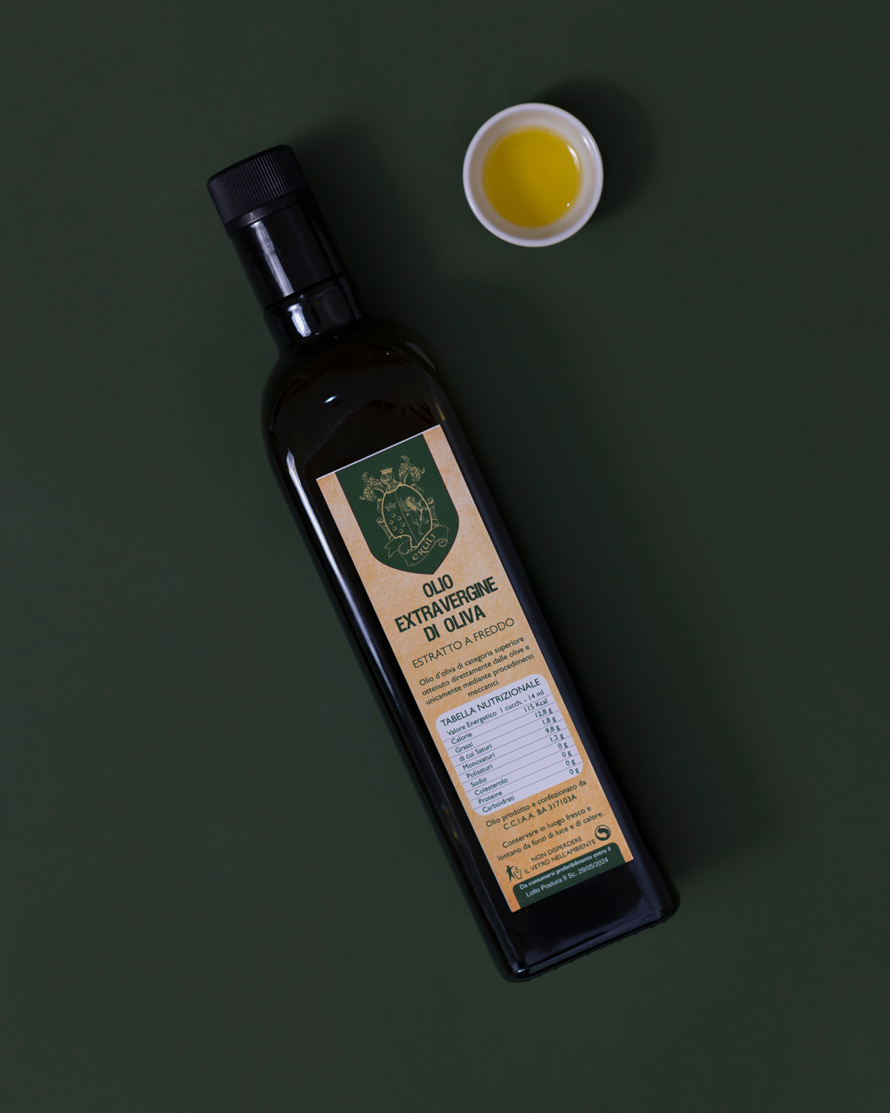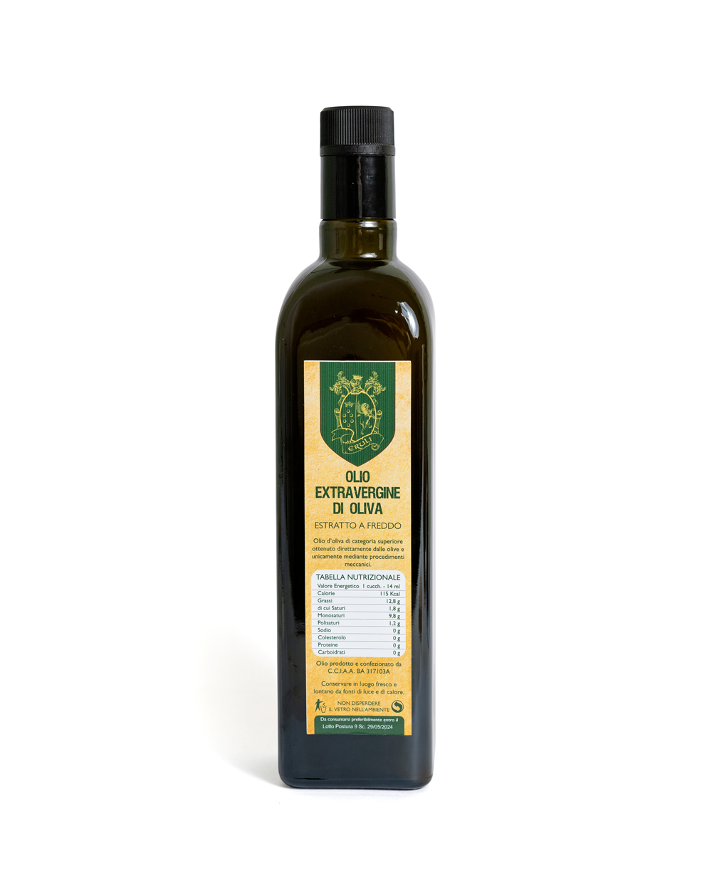 Il nostro olio è prodotto a freddo dopo un’accurata selezione delle migliori olive di cultivar della Puglia nella città di Barletta (Puglia Imperiale) e zone limitrofe per ottenere un extravergine di oliva dal profumo carciofato e mandorlato, con il sapore di pomodoro dal retrogusto mediamente amarognolo e piccante, molto equilibrato e versatile, da utilizzare in tutte le preparazioni della cucina mediterranea.